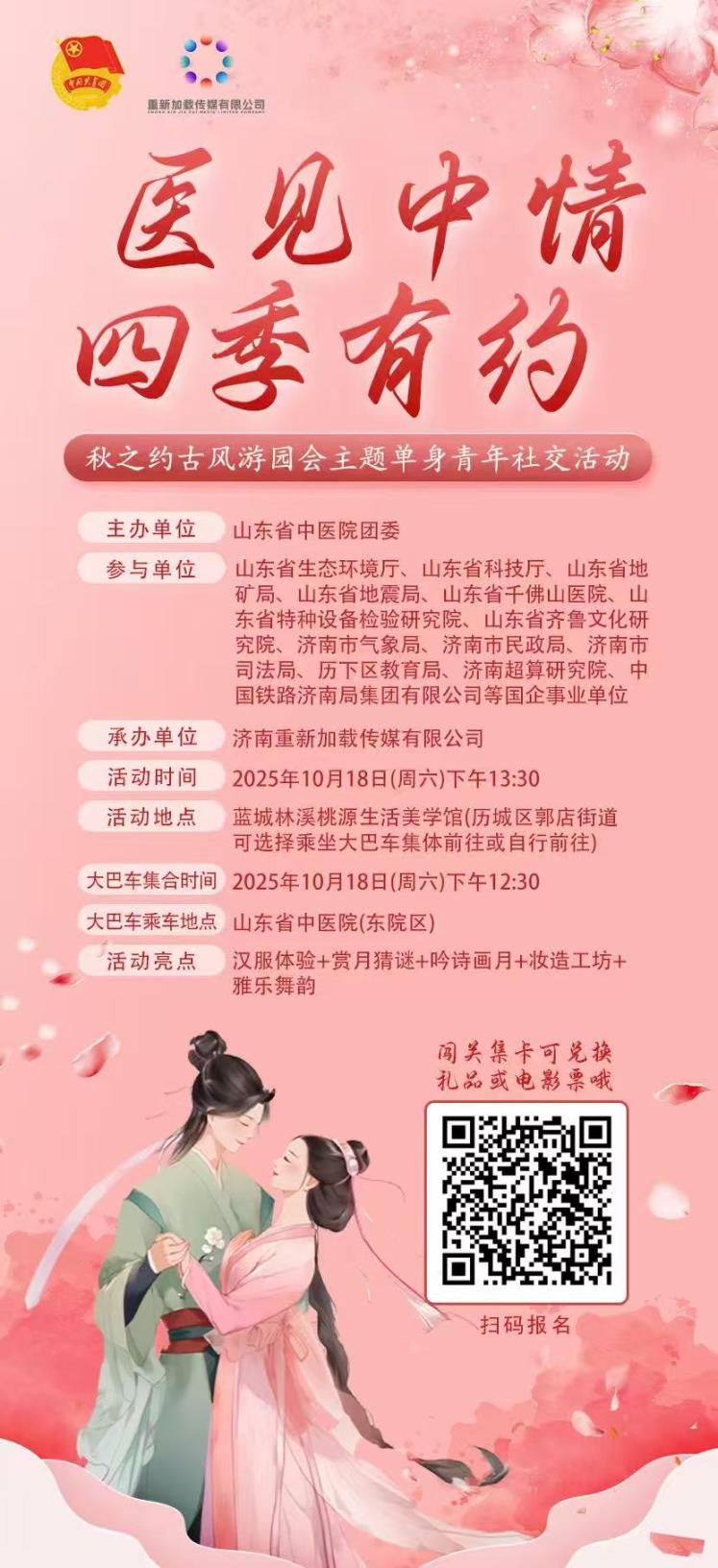 山东省中医院团委拟于2025年10月18日(周六)下午13:30在蓝城林溪桃源生活美学馆(历城区郭店街道)开展“医见中情 四季有约”——秋之约古风游园会主题单身青年社交活动,诚邀山东省资产评估行业适龄青年职工参加,有意愿者,踊跃扫码报名。具体活动流程详见附件。