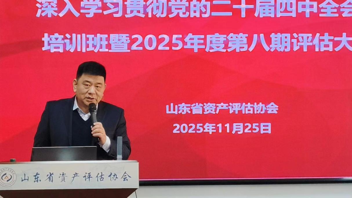11月25日,山东省资产评估协会深入学习贯彻党的二十届四中全会精神培训班暨2025年度第八期评估大讲堂在省评协会议室成功举办。本次活动采取线上线下相结合的模式,省评协全体员工现场参与,省评协视频号同步直播,累计400余人次观看。省评协副会长兼秘书长王文胜在活动中致辞,活动指出党的二十届四中全会精神对我省资产评估行业具有重要的指导意义,我省从业人员要立足行业发展新阶段、紧扣政策导向,努力提升综合素养,助力行业高质量发展。