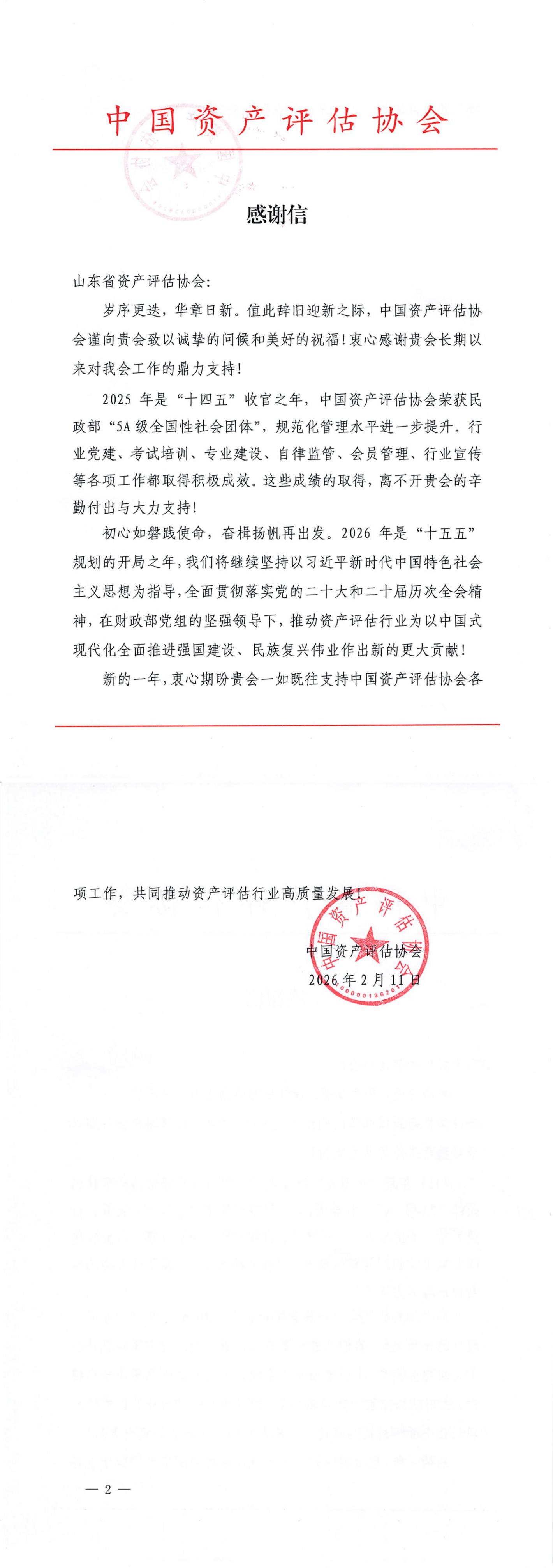 山东评协荣获中国资产评估协会感谢信
